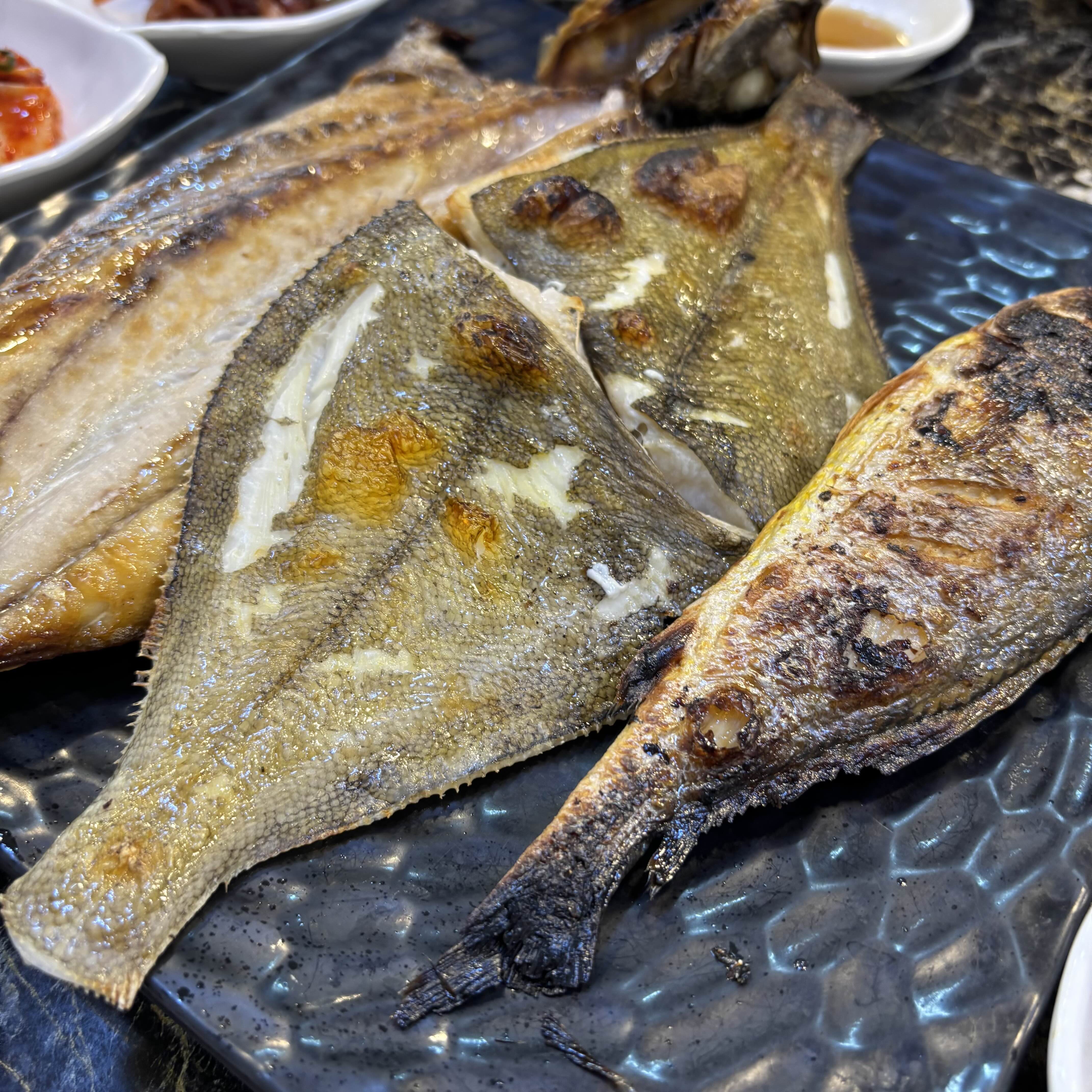 모둠생선구이 소자를 주문했다. 고등어, 조기, 가자미 3종 생선이 한 접시에 나오는 알찬 구성이다. 두툼한 살에 담백한 맛, 노릇노릇 구워진 불향까지 더해져 만족도가 높았다.