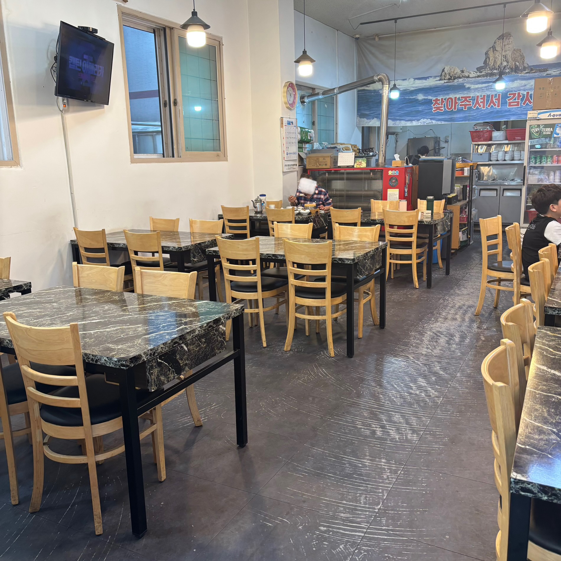 매장은 넓고 쾌적하며 단체 손님도 수용 가능한 규모다. 내부에 바닷가 풍경이 걸려 있어 해산물 전문점 분위기를 물씬 느낄 수 있다.