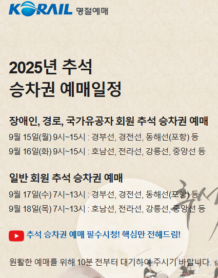 추석 기차표는 보통 승차일 기준 약 한 달 전, 2\~3일에 걸쳐 사전예약이 진행됩니다.