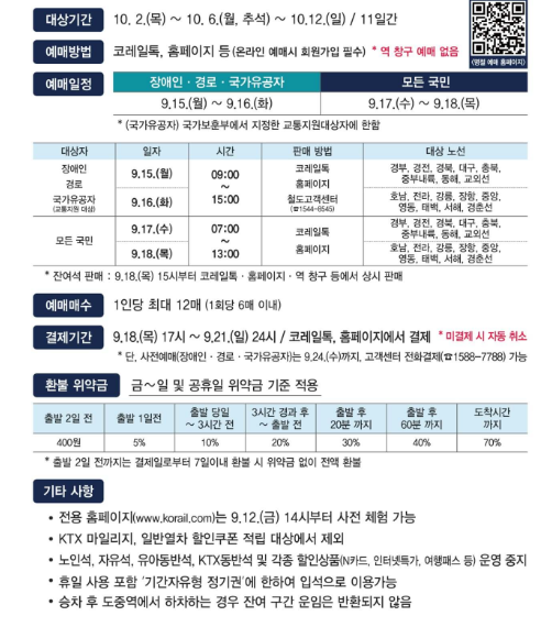 예매는 코레일 홈페이지, 코레일톡 앱, 전화 접수(장애인·경로 대상)를 통해 가능하며, 선착순 방식으로 운영됩니다.